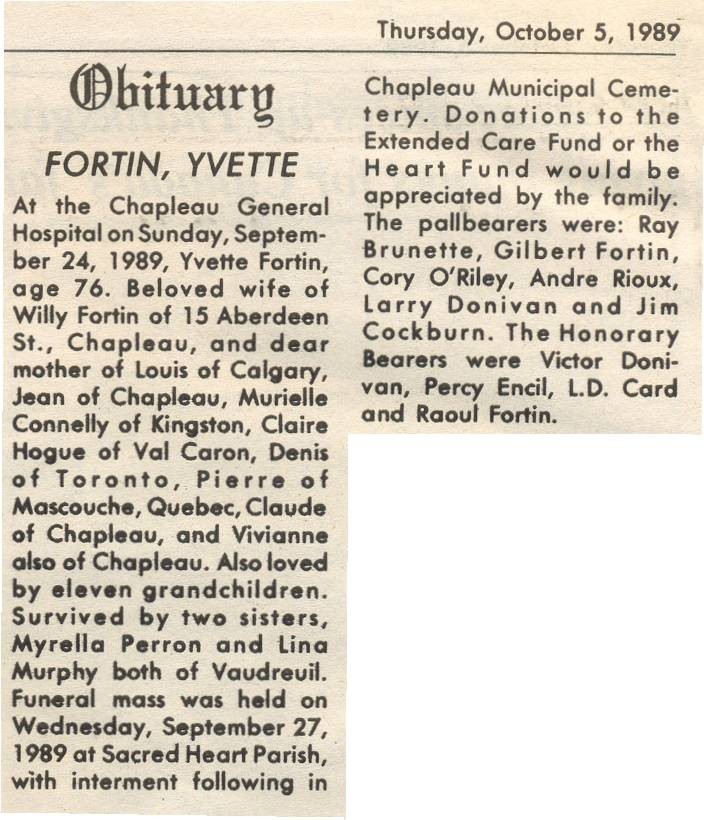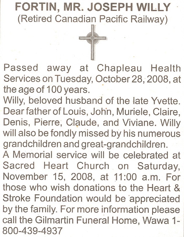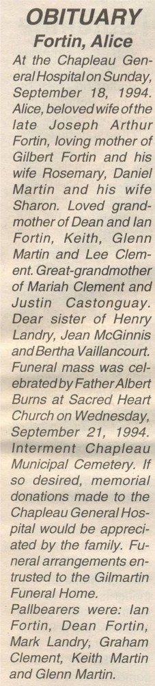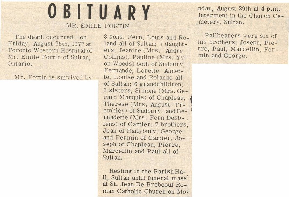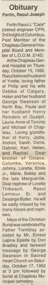 These Obituaries were compiled for the Chapleau Public Library
