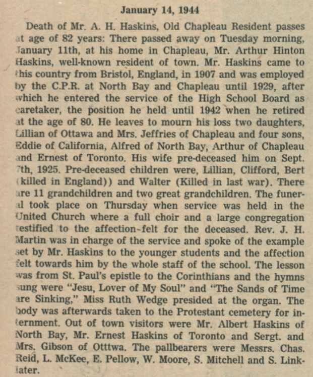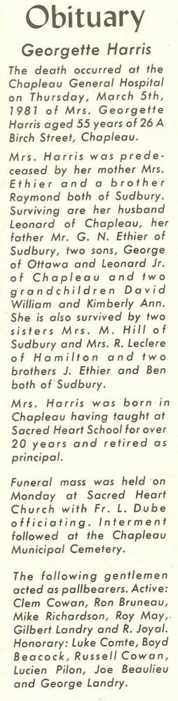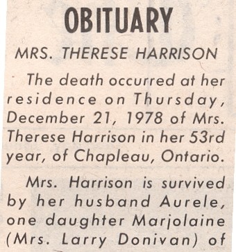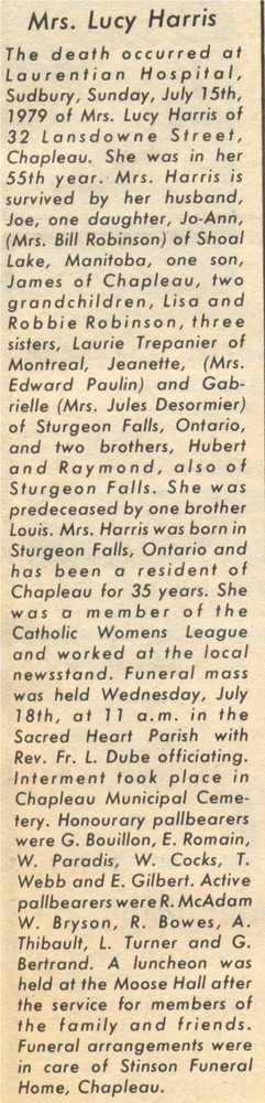 These Obituaries were compiled for the Chapleau Public Library