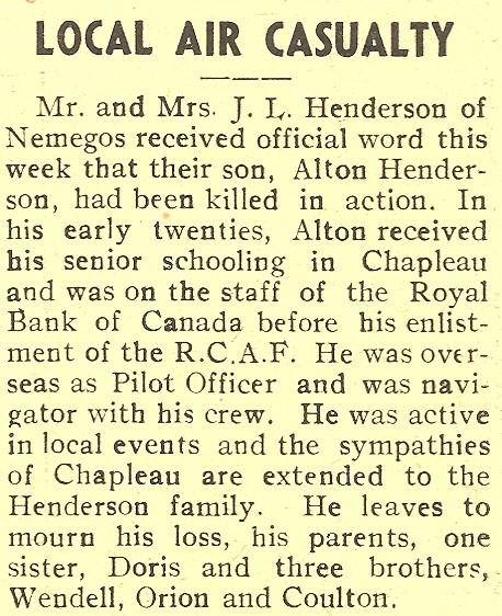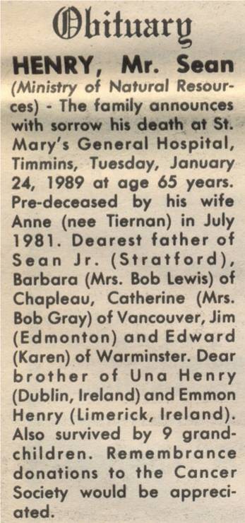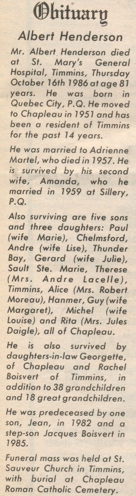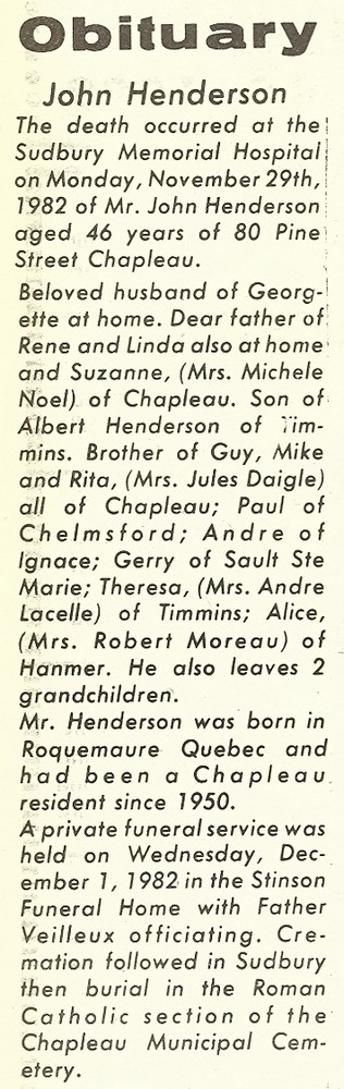 These Obituaries were compiled for the Chapleau Public Library