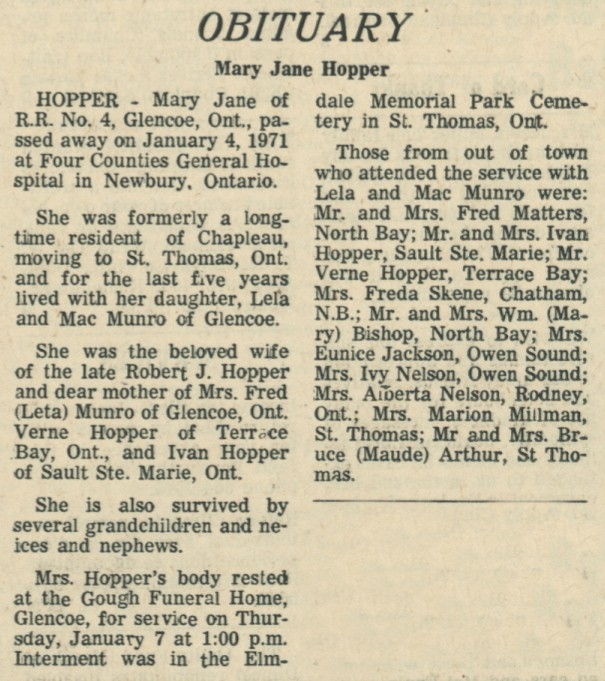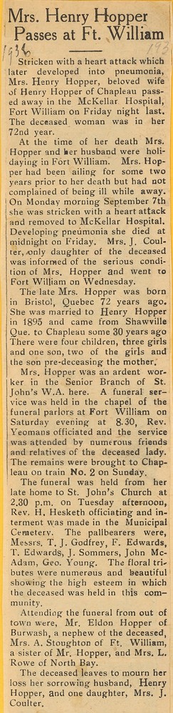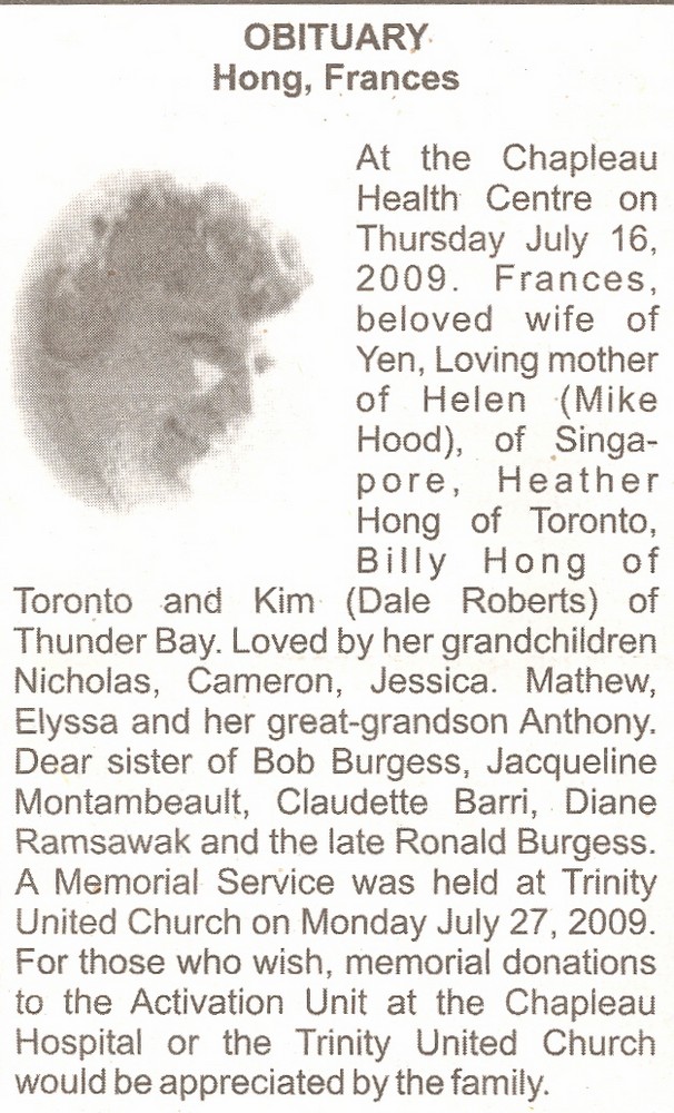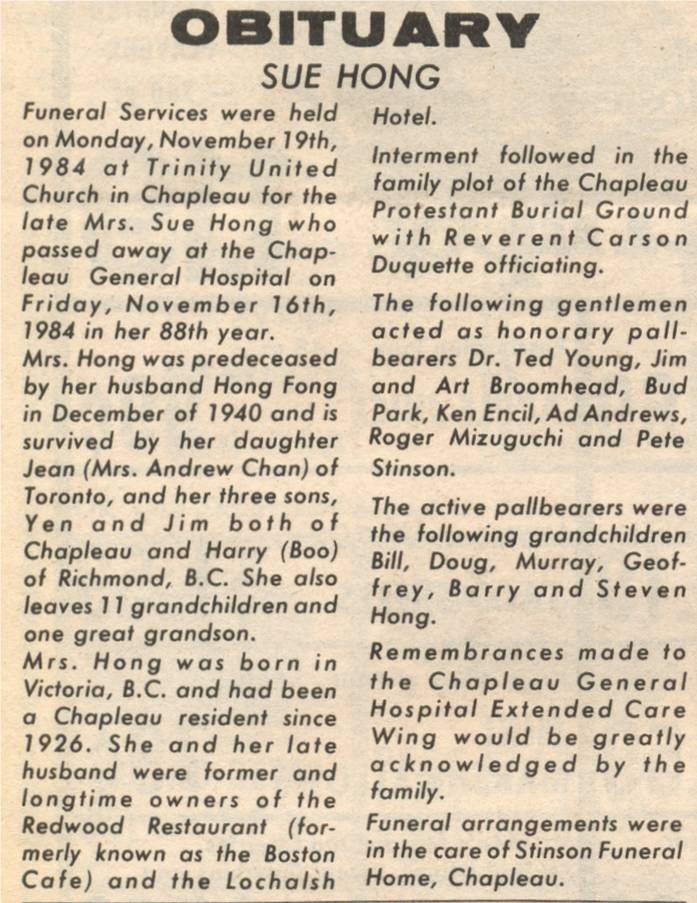 These Obituaries were compiled for the Chapleau Public Library