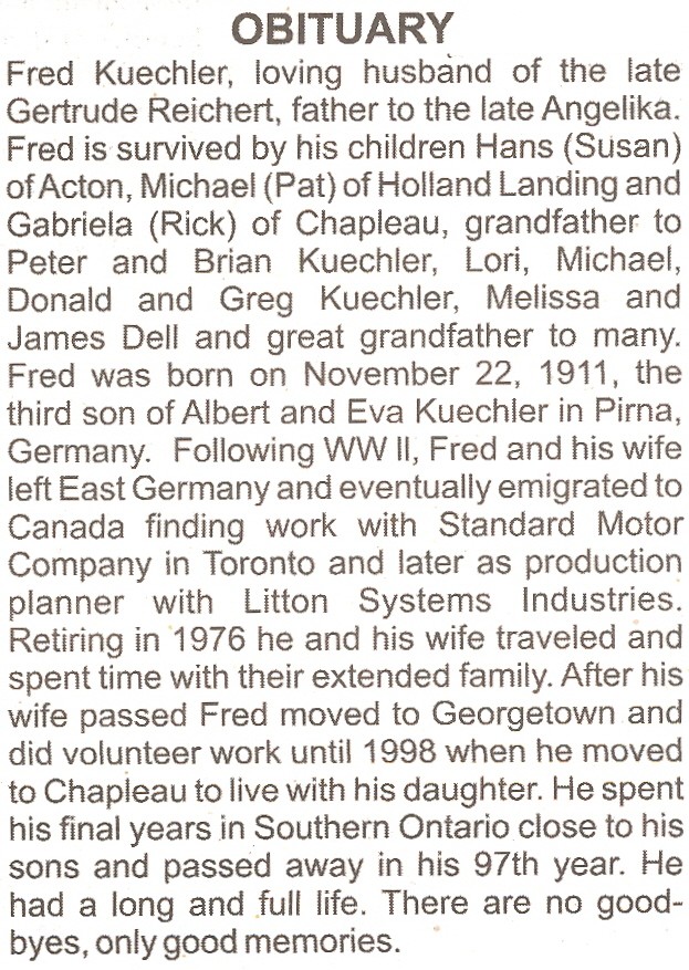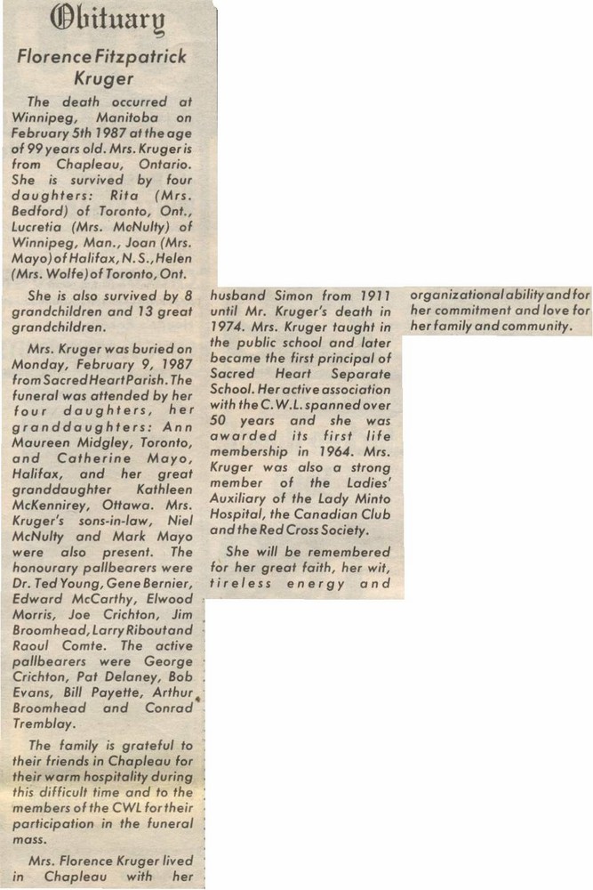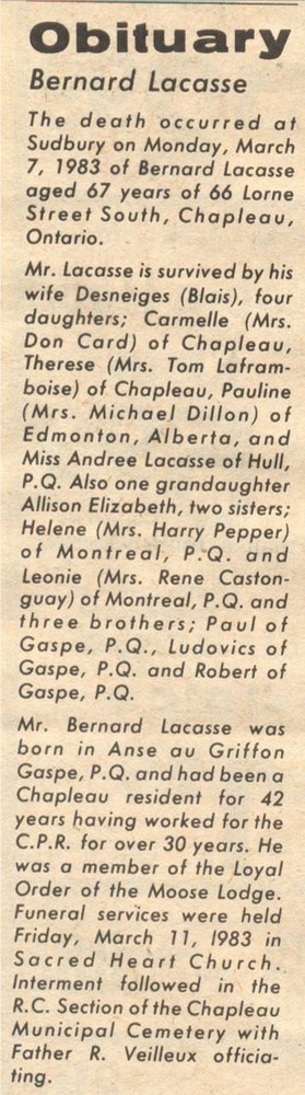 These Obituaries were compiled for the Chapleau Public Library