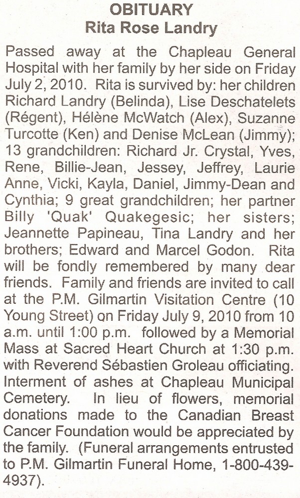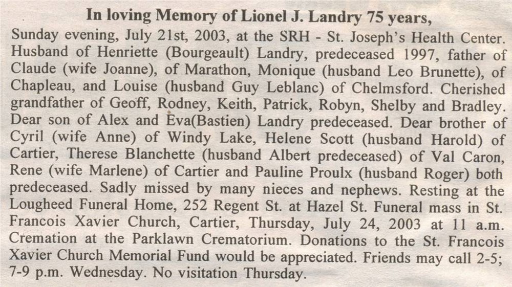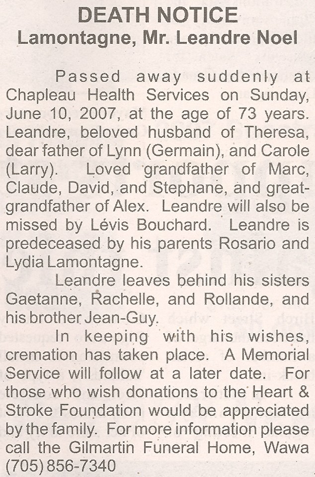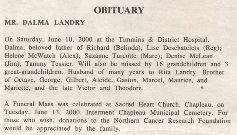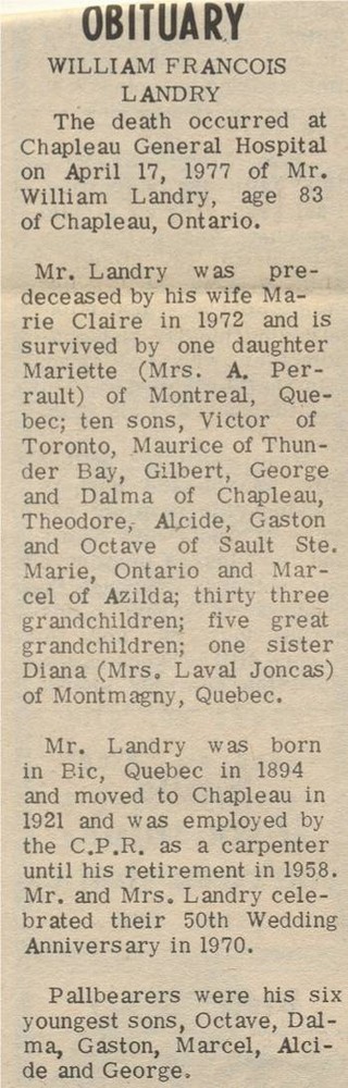 These Obituaries were compiled for the Chapleau Public Library