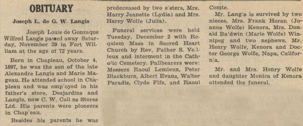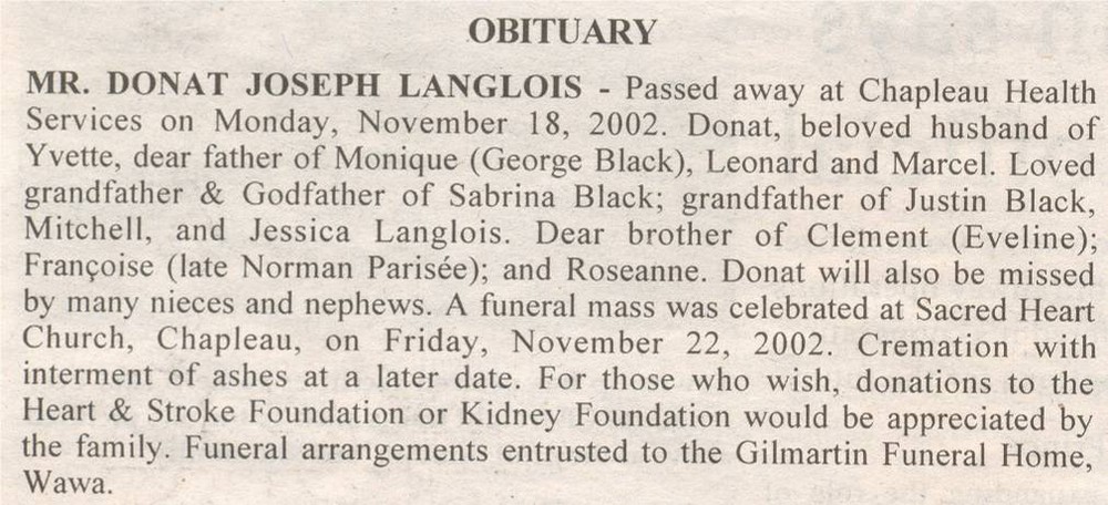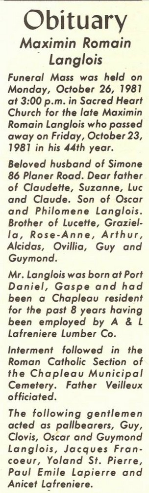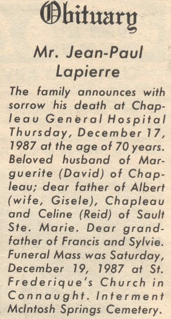 These Obituaries were compiled for the Chapleau Public Library