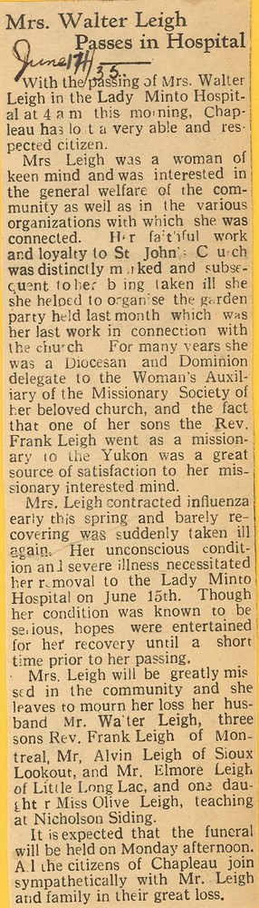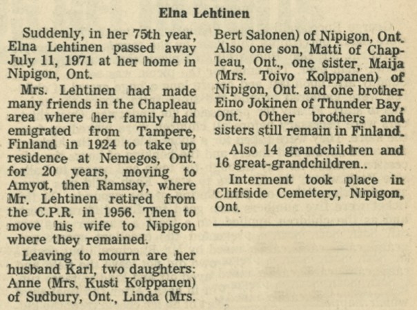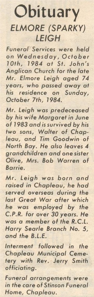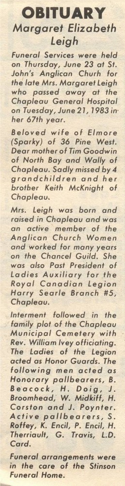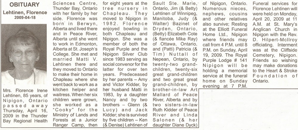 These Obituaries were compiled for the Chapleau Public Library