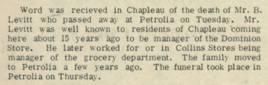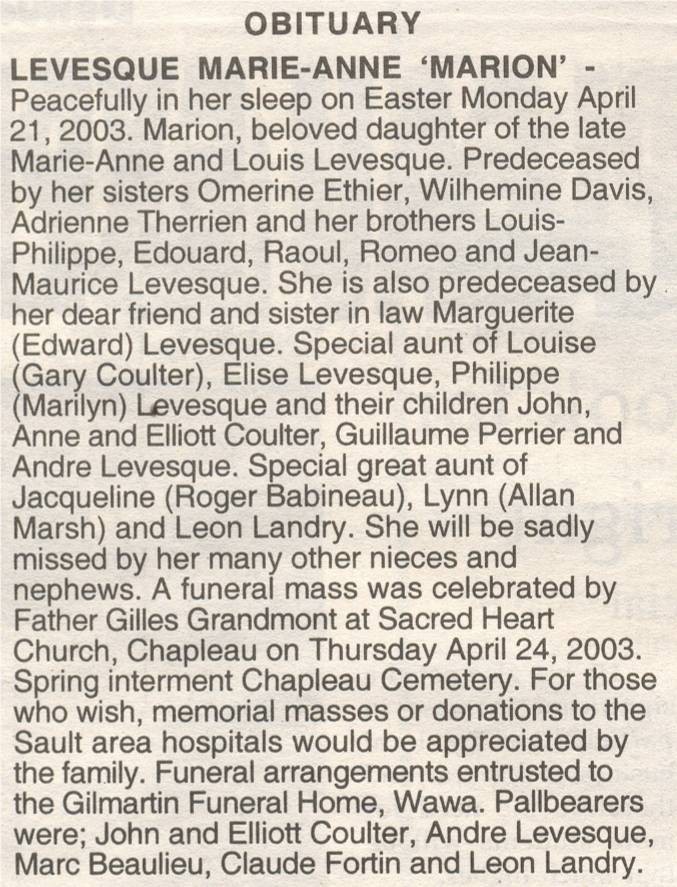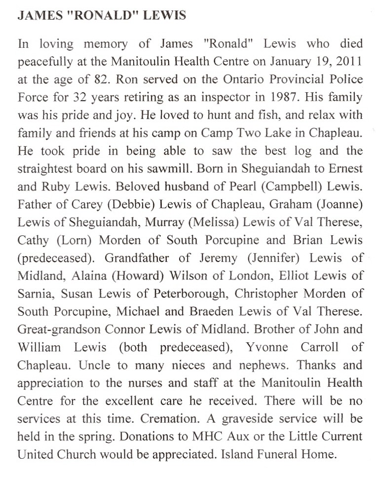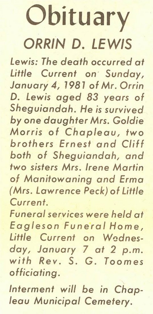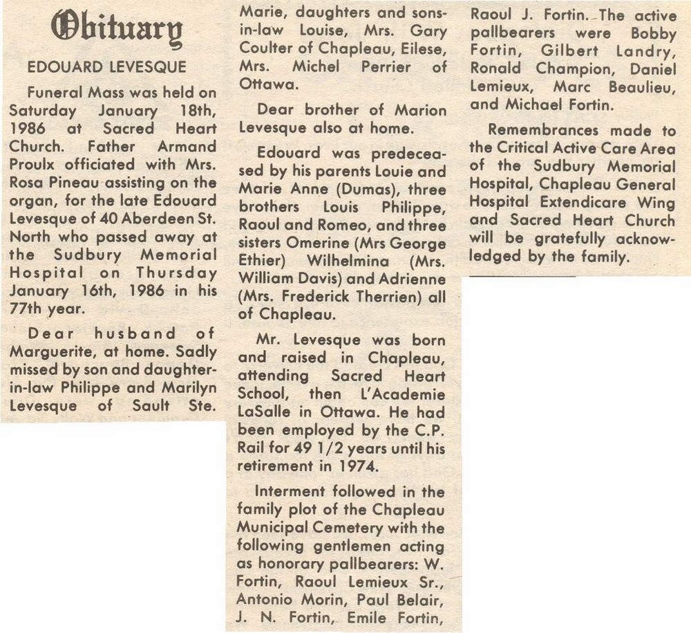 These Obituaries were compiled for the Chapleau Public Library