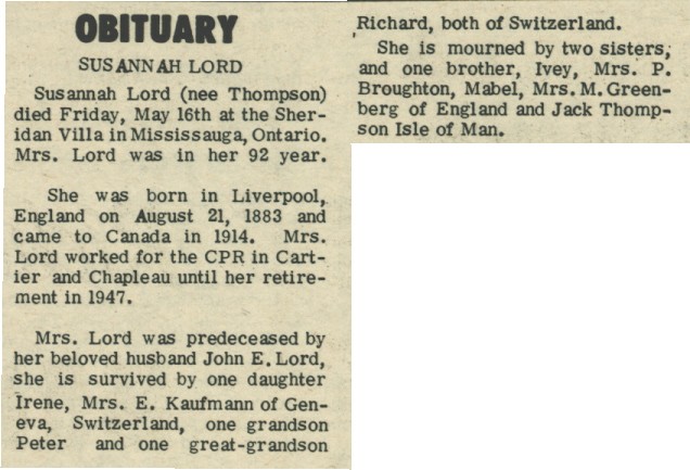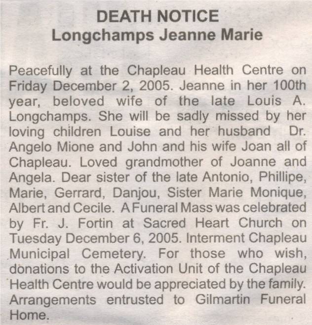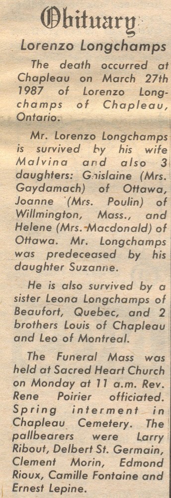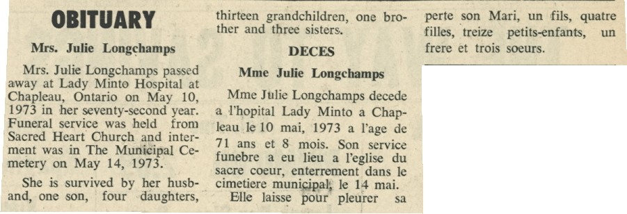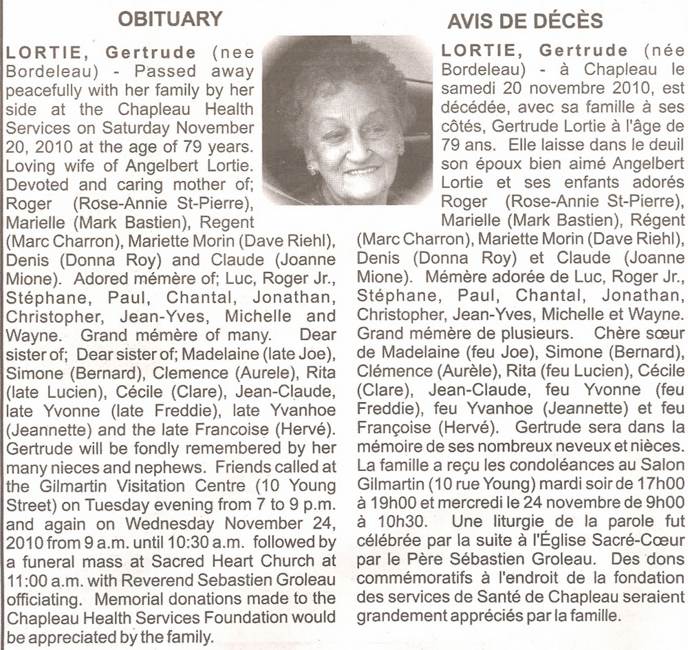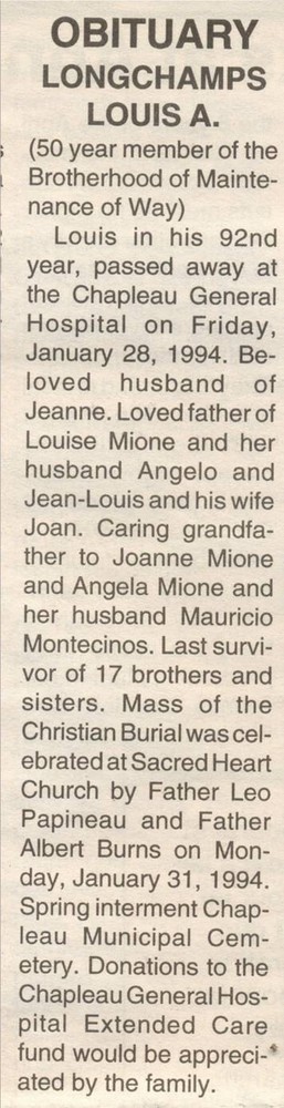 These Obituaries were compiled for the Chapleau Public Library