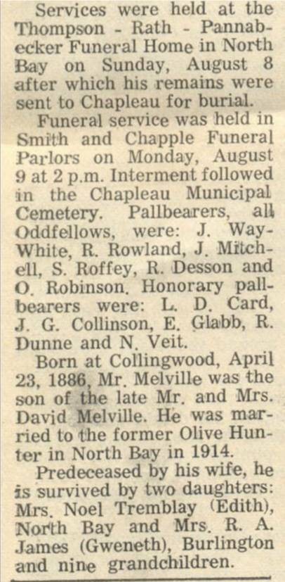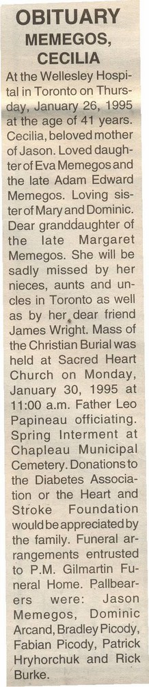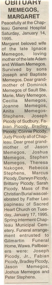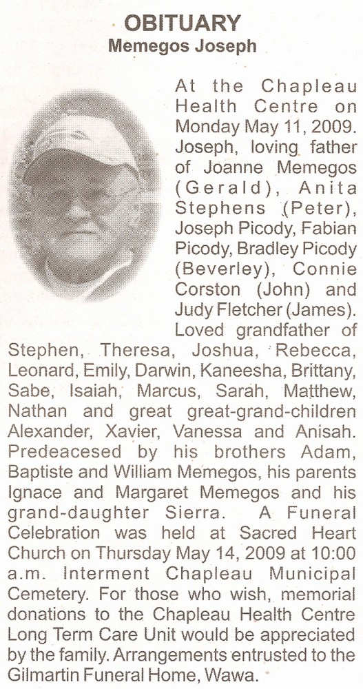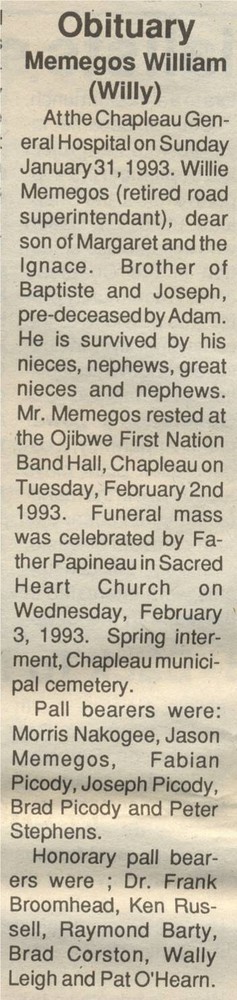 These Obituaries were compiled for the Chapleau Public Library