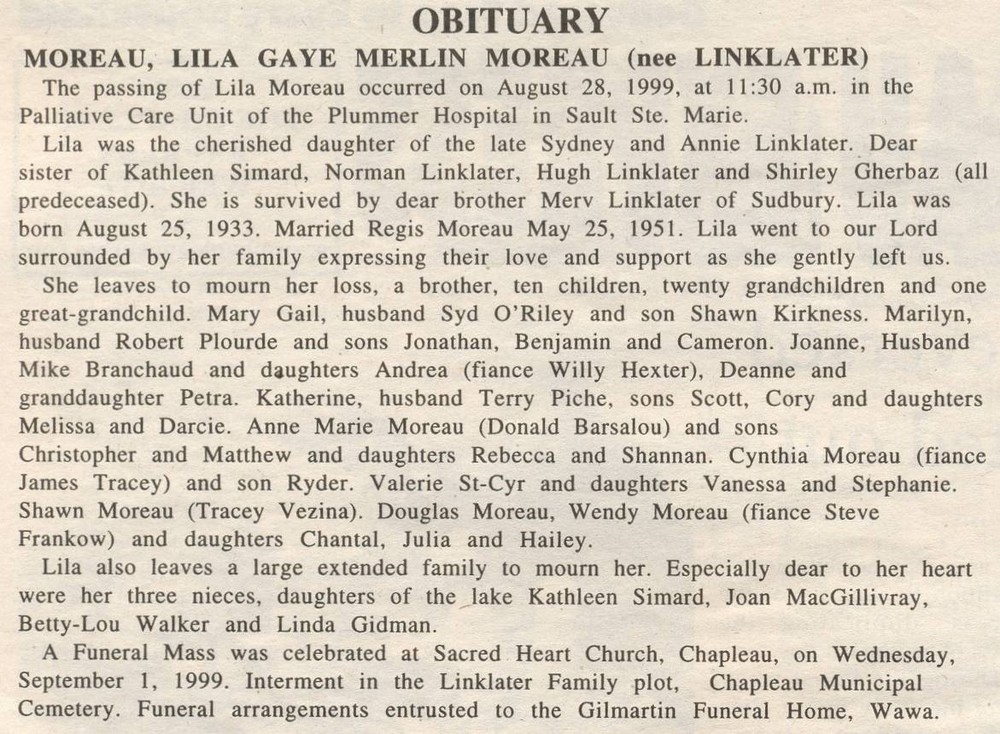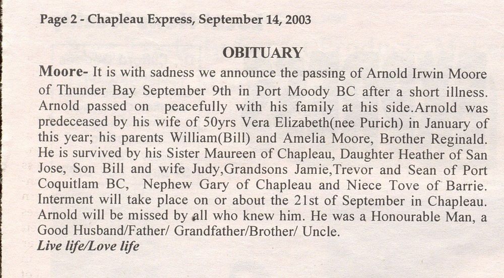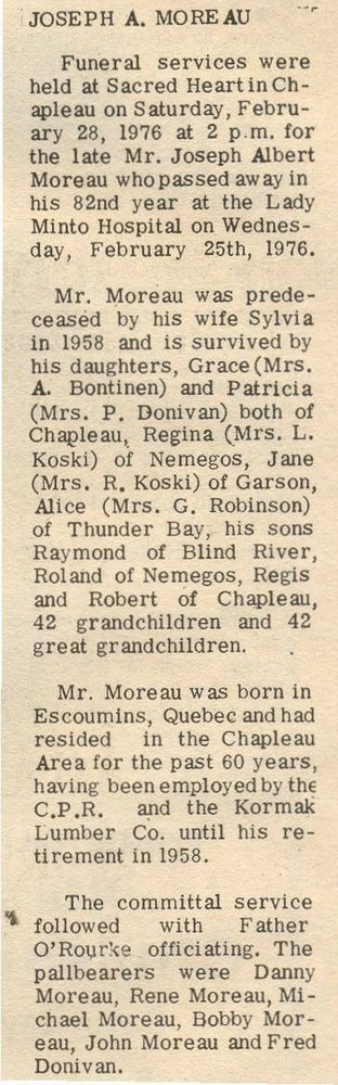 These Obituaries were compiled for the Chapleau Public Library