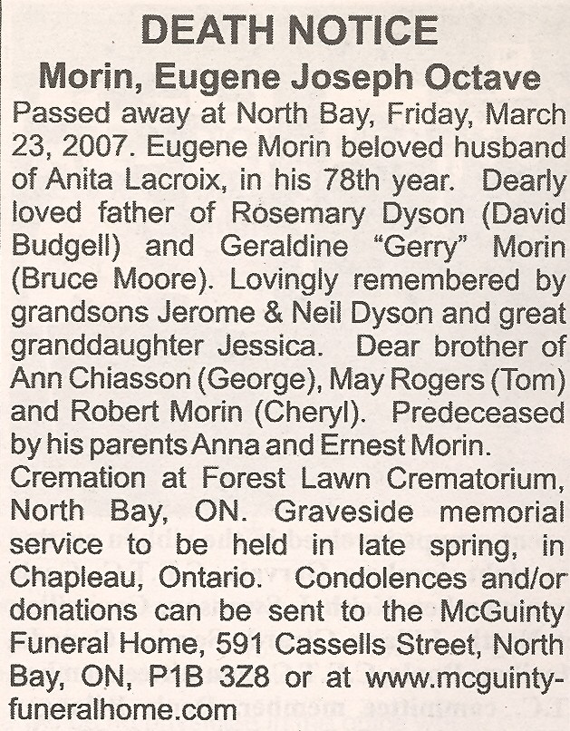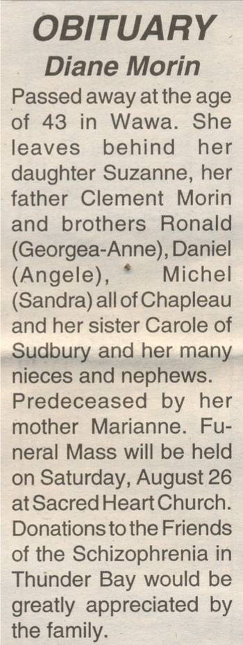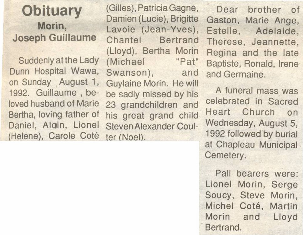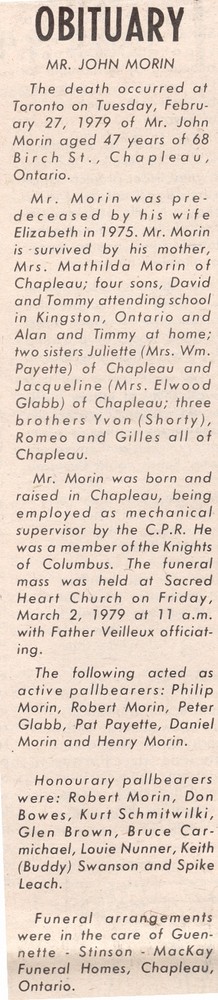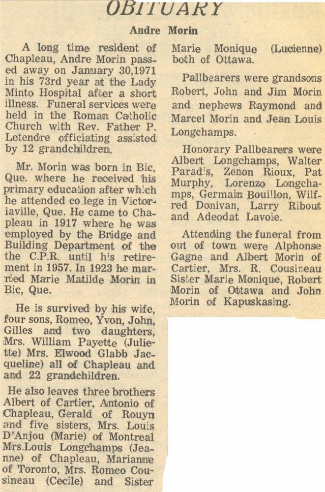 These Obituaries were compiled for the Chapleau Public Library