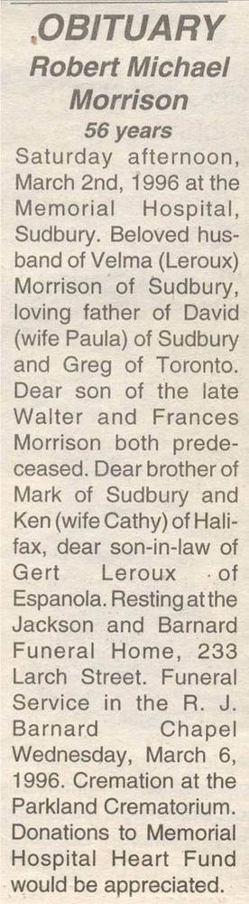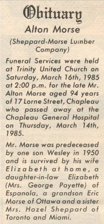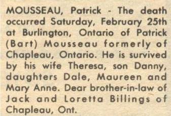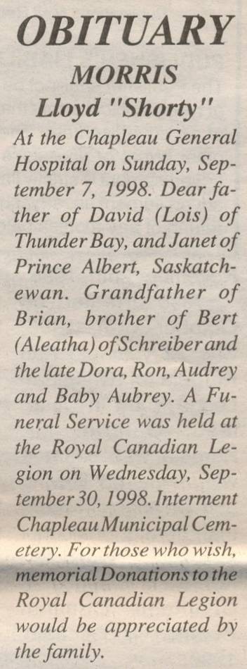 These Obituaries were compiled for the Chapleau Public Library