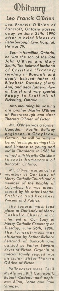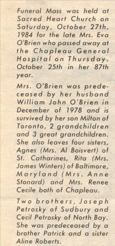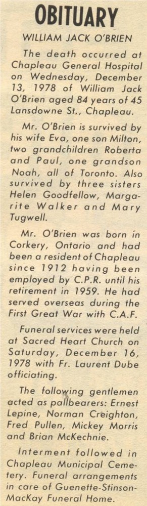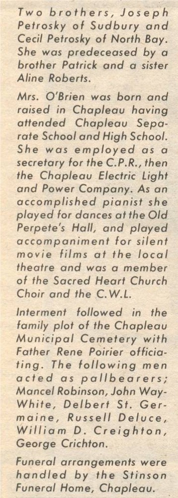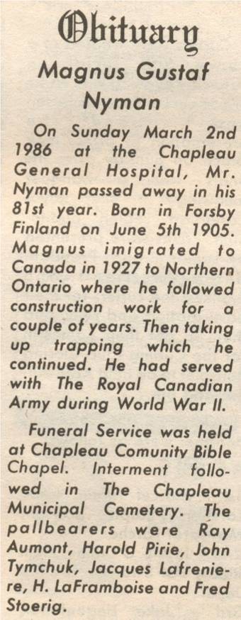 These Obituaries were compiled for the Chapleau Public Library