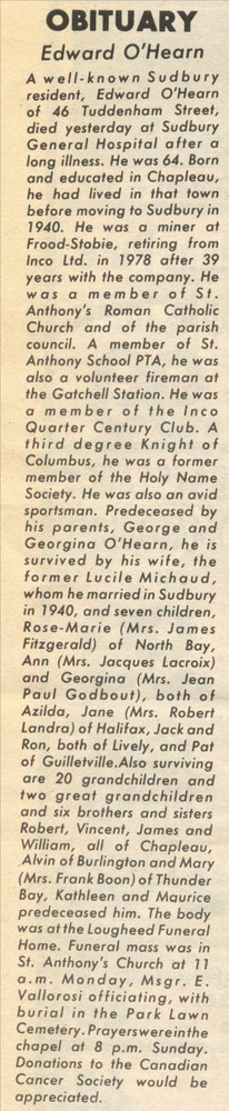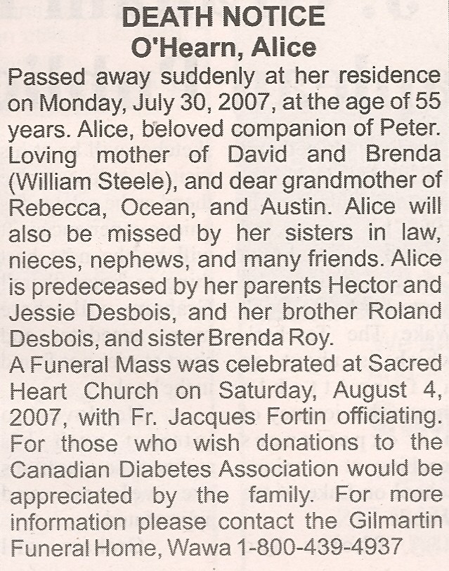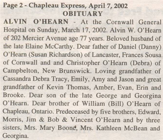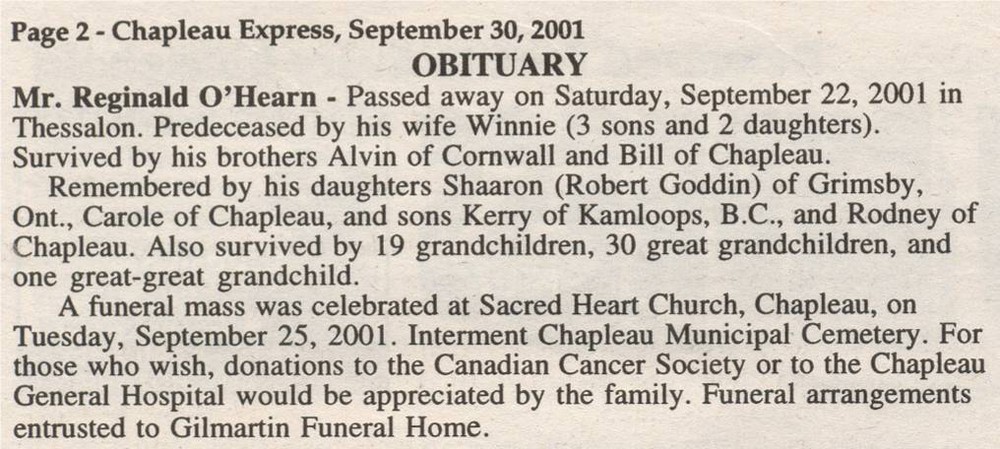 These Obituaries were compiled for the Chapleau Public Library
