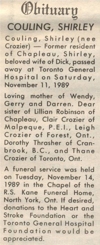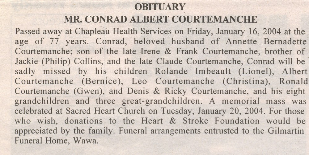 These Obituaries were compiled for the Chapleau Public Library